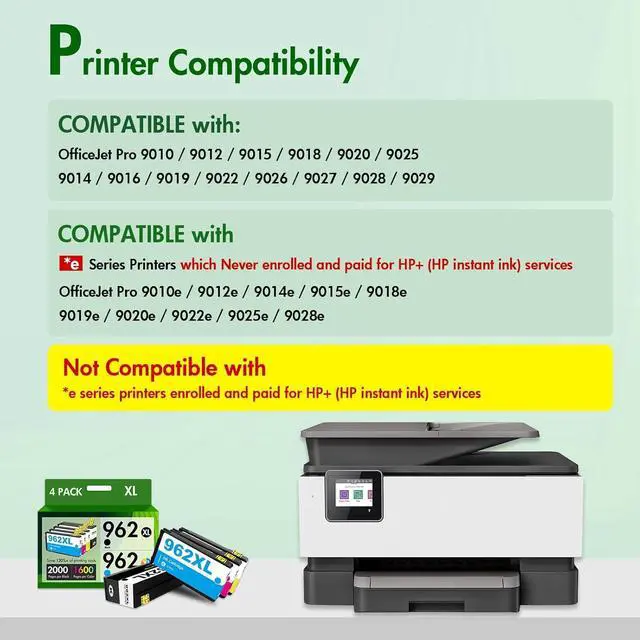 Compatible Printers: 962xl/962 ink cartridges combo pack compatible for *e series printers which Never enrolled and paid for HP+ services, such as OfficeJet Pro 9015e 9018e 9025e 9010e 9012e 9014e 9019e 9020e 9022e 9028e Printer