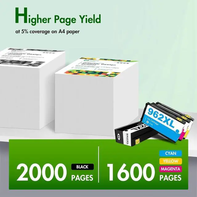 High Page Yield: Print more paged with X-Large capacity. It yields up to 2,000 pages for each 962XL Black Ink and 1,600 pages for each 962XL Color Ink at 5% coverage (A4/letter)