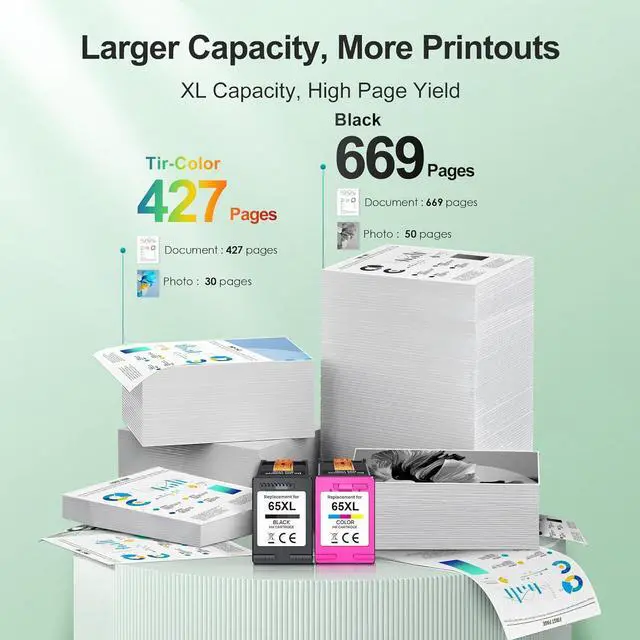 Cartridge yield (approx.): up to 4x more prints with us vs others: 650 pages for hp 65 black ink cartridge, 450 pages for hp ink 65 tri-color