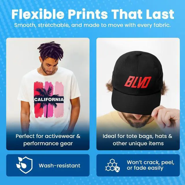 DTF INK FOR ALL FABRIC TYPES : Printium 250ML DTF Ink bonds seamlessly to cotton, polyester, rayon, nylon, and cotton-blend fabrics. Designed for soft-feel results that wont crack, peel, or fade. Create stunning full-color garments from graphic tees and babywear to workwear and custom merch. Built to perform across all DTF film types and garment applications.