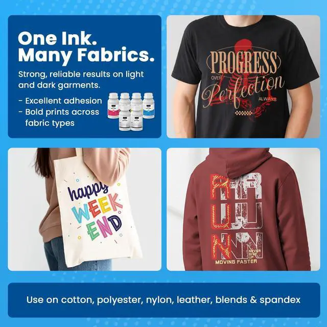 HIGH YIELD & BRILLIANT COLOR OUTPUT : Delivers bright white underbase and bold CMYK color saturation for vivid, full-coverage printing. Achieve professional results on apparel, promotional products, and more. High-yield ink means fewer refills and more productivity. Trusted by print shops and creators for consistent, long-lasting DTF transfers with zero compromise on vibrancy.