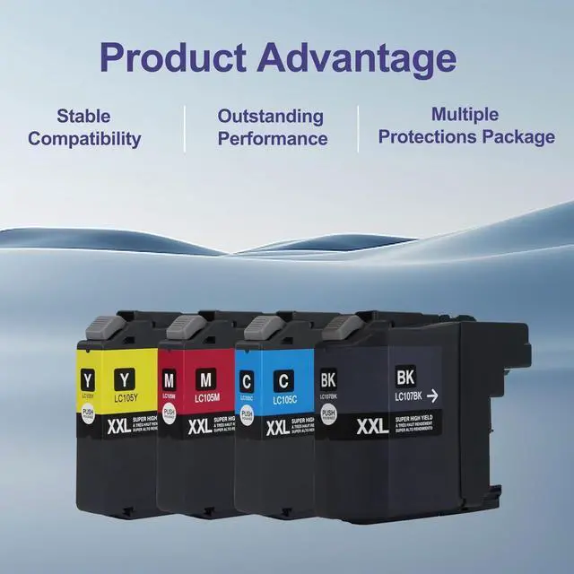 What's in the box: LC107 LC105 XXL Ink Cartridge Set 4 Pack includes 1 x LC107XXL Black ink,1 x LC105 Cyan ink,1 x LC105 Magenta ink,1 x LC105 Yellow ink