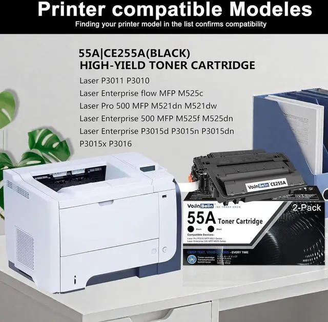 Package contents: 2 pack compatible 55A CE255A black toner cartridge
