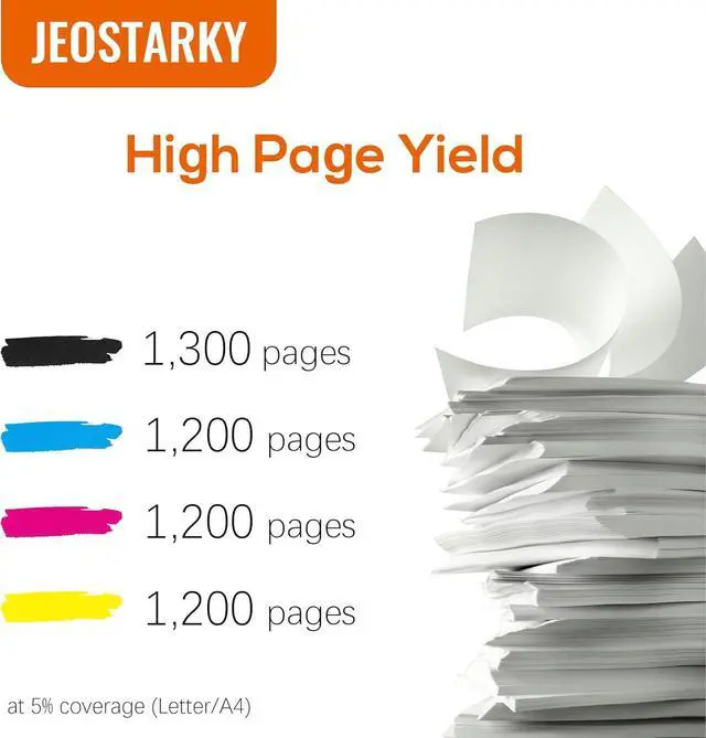 High Page YieldThe black cartridge prints about 1,300 pages, and each color cartridge prints about 1,200 pages at 5% coverage