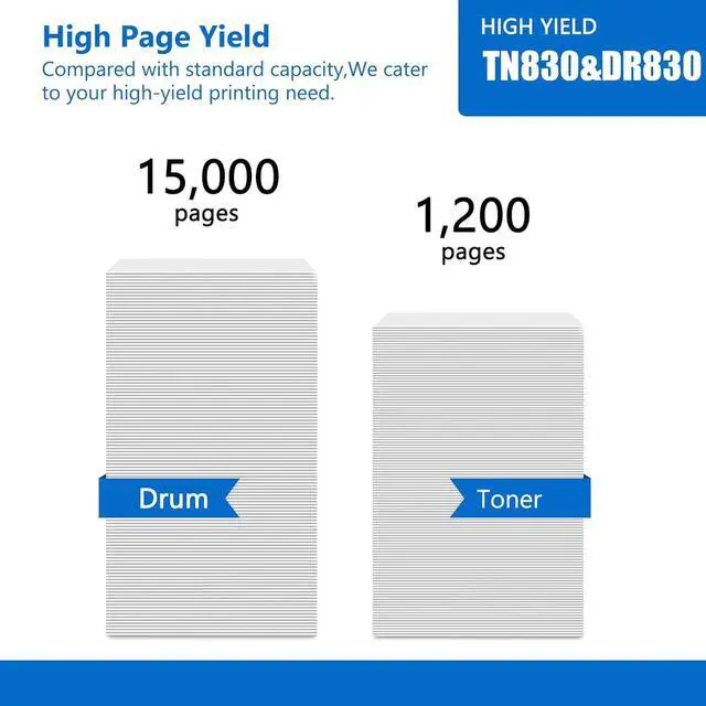 High page yield: TN830 Toner is 1,200 Pages Per Cartridge, DR830 DR-830 Drum Unit is 15,000 Pages Per Drum Unit coverage rate of 5% (letter/A4)