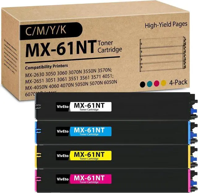 Contents: VivEto replacement for Sharp MX-61NT toner cartridges; 1 X MX-61NT black toner cartridge (MX-61NT-BA), 1 X MX-61NT yellow toner cartridge (MX-61NT-YA), 1 X MX-61NT magenta toner cartridge(MX-61NT-MA), 1 X MX-61NT cyan toner cartridge (MX-61NT-CA)