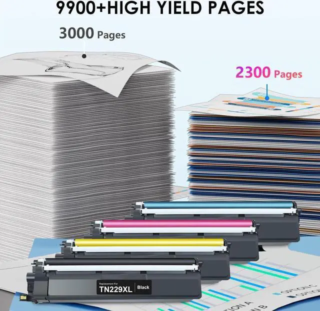 High Page Yield: Extra large toner TN229XL Black is 3,000 pages and TN229XL Cyan/Magenta/Yellow is 2,300 Pages per toner cartridge (Letter A4, at 5% coverage)