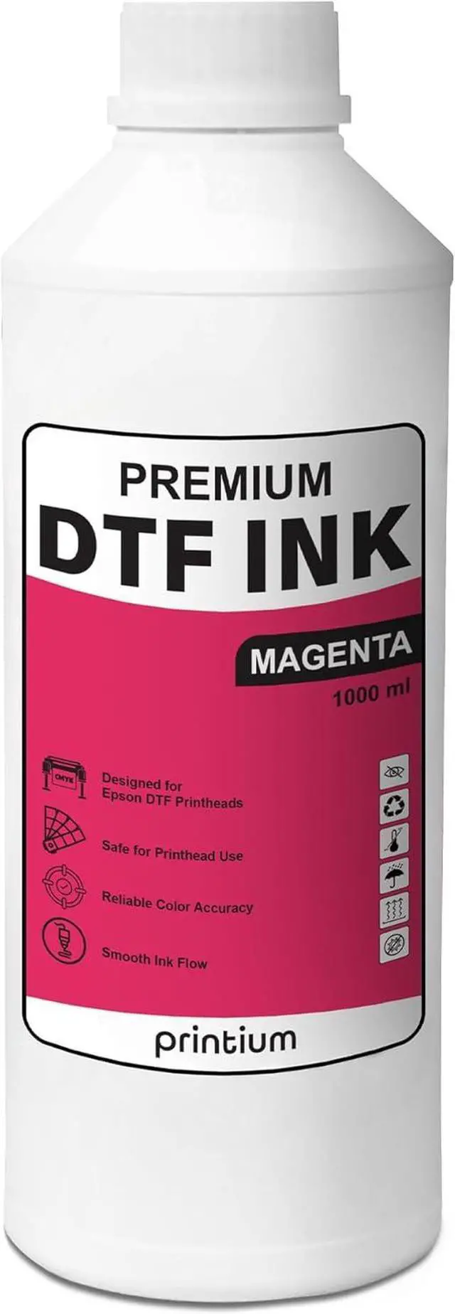 BOLD MAGENTA DTF INK FOR VIBRANT PRINTS : Printium magenta DTF ink delivers rich, saturated pink tones and vivid contrast on both light and dark garments. Designed for PET film heat transfers on cotton, polyester, blends, tote bags, hoodies & more.