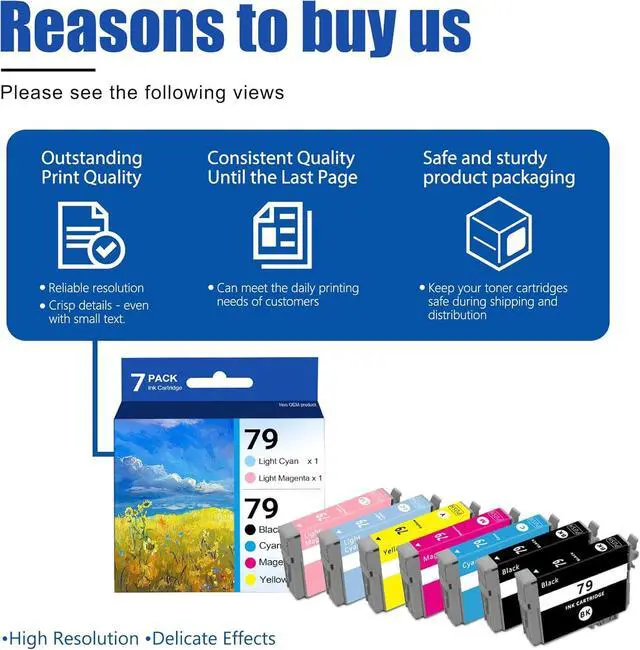 In this Package: 7 Packs 79 Ink Cartridges set includes 2 x T079120 Black ink cartridge,1 x T079220 Cyan ink cartridge,1 x T079320 Magenta ink cartridge,1 x T079420 Yellow ink cartridge,1 x T079520 Light Cyan ink cartridge,1 x T079620 Light Magenta ink cartridge