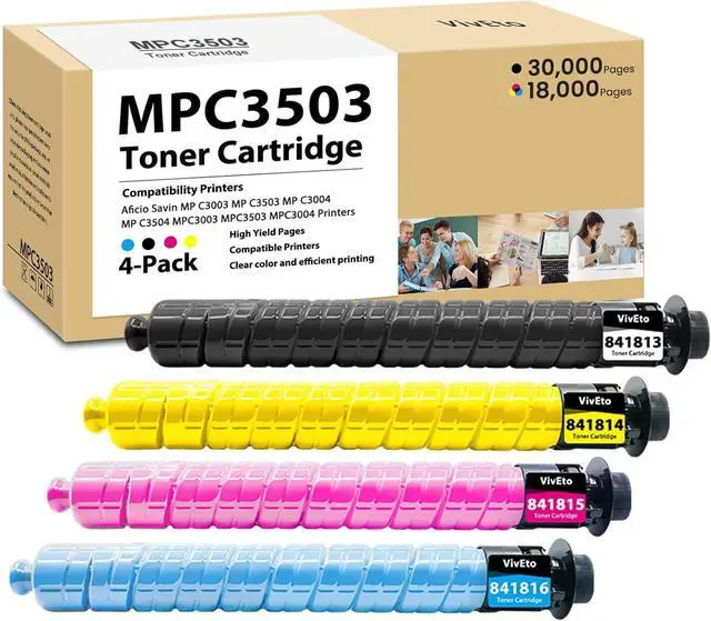 Contents: VivEto toner replacement for Ricoh C3503 toner cartridge; 1 X MP C3503 toner Black (841813); 1 X MP C3503 Yellow toner (841814); 1 X MP C3503 Magenta toner (841815); 1 X toner MP C3503 Cyan (841816)