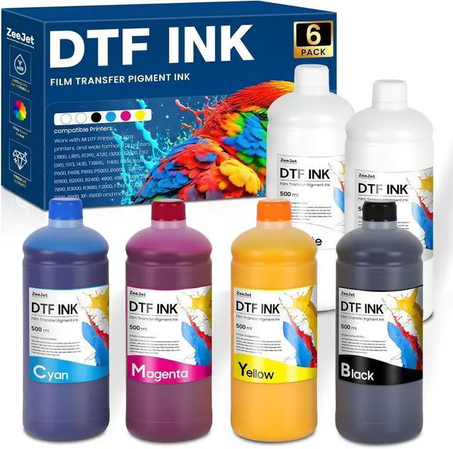 What's in the box: 2 x DTF White Ink 500ml, 1 x DTF Black Ink 500ml, 1 x DTF Cyan Ink 500ml, 1 x DTF Magenta Ink 500ml, 1 x DTF Yellow Ink 500ml, total 6 x 500ml DTF Ink (3000ml)