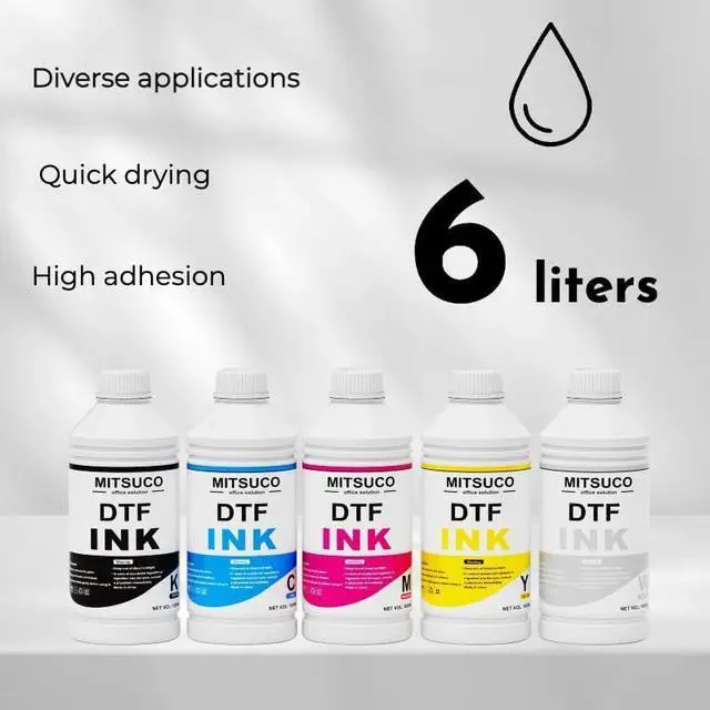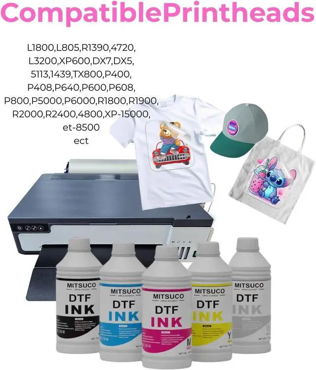 Wide Compatibility: Mitsuco dtf ink works with many DTF printers, including six-color and eight-color models supporting cadlink software. Its compatible with DTF films and powders, ideal for desktop, A3, and wide-format printers. Compatible printheads: et-8550, L1800, L805, R1390, 4720, I3200, XP600, DX7, DX5, 5113, 1430, TX800, P400, P408, P640, P600, P608, P800, P5000, P6000, R1800, R1900, R2000, R2400, 4800, 4880, 4900, 7880, 7890, R3000, R3880, F2000, F2100, F2200, P700, P900, XP-15000, etc.