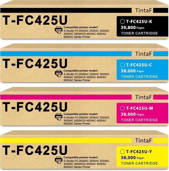 Product Name: TintaF T-FC425U Toner Cartridges 4-Pack (Black/Cyan/Magenta/Yellow) Replacement for Toshiba T-FC425U-K, T-FC425U-C, T-FC425U-M, T-FC425U-Y Toner Cartridge