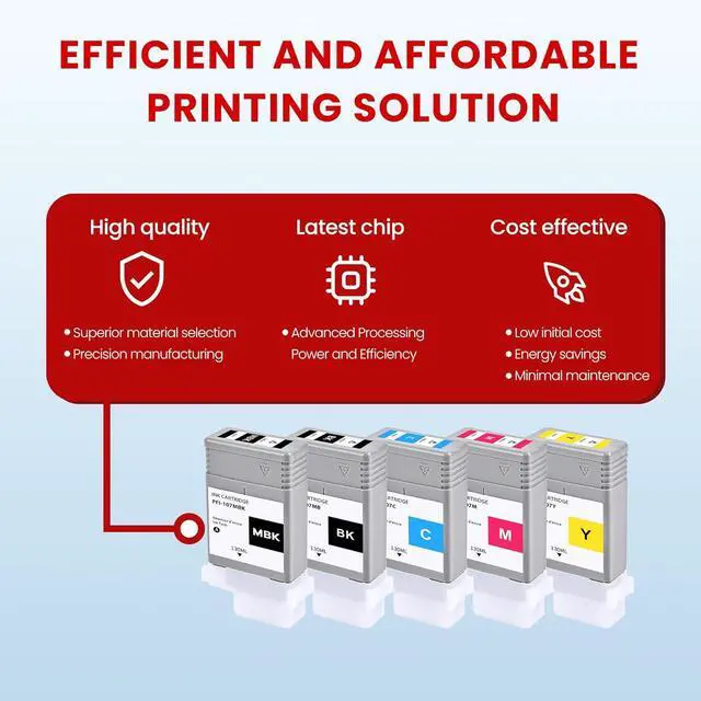 Smart chip technology: PFI-107 ink cartridge with smart chip enables instant auto-recognition and full compatibility. Its plug-and-play design eliminates setup hassles, delivering seamless office productivity