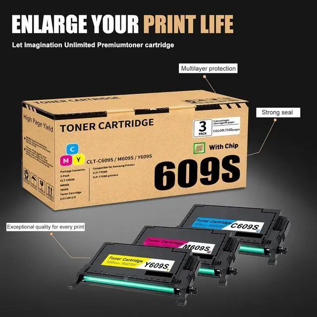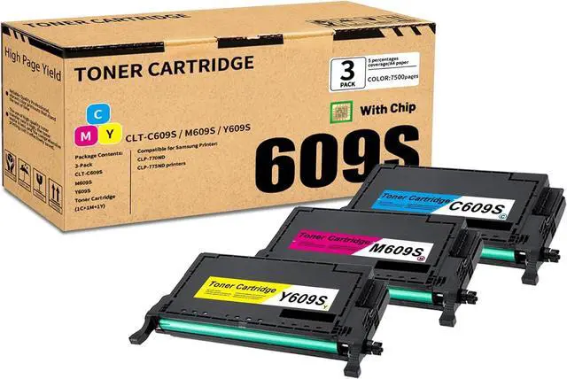 Package Contents: 1 Pack CLT-C609S Cyan Toner Cartridge; 1 Pack CLT-M609S Magenta Toner Cartridge; 1 Pack CLT-Y609S Yellow Toner Cartridge.