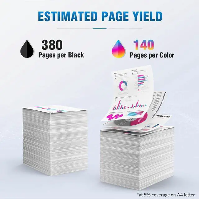 [ High Page Yield ] Up to 380 pages per black cartridge and 140 pages per color cartridge at 5% coverage.