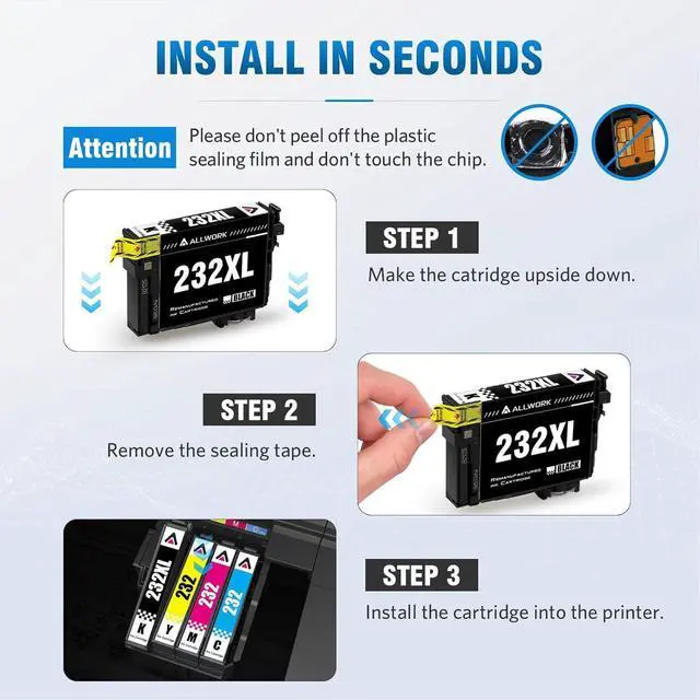 [ Package Contents ] 5 Pack of ALLWORK Remanufactured Ink Cartridge fo 232XL T232XL T232 T232XL120 T232XL220 T232XL320 T232XL420 ( 2 Black T232XL / 1 Cyan T232 / 1 Magenta T232 / 1 Yellow T232 )