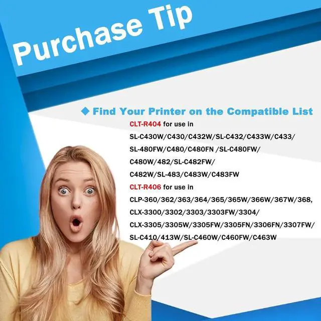 Compatible Printers: Compatible for Samsung CLT-R404 CLT-R406 for SL-C430W/C430/C432W/SL-C432/C433W/C433/SL-480FW/C480/C480FN/SL-C480FW/C480W/482/SL-C482FW/C482W/SL-483/C483W/C483FW CLP-360/362/363/364/365/365W/366W/367W/368, CLX-3300/3302/3303/3303FW/3304/CLX-3305/3305W/3305FW/3305FN/3306FN/3307FW/SL-C410/413W/SL-C460W/C460FW/C463W Printer.