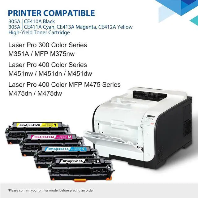 This 305A cartridges works with: Pro 400 Color M451dn M451dw M451nw Pro 400 Color MFP M475dw M475dn; Pro 300 Color MFP M375nw Pro 300 Color M351A Printer