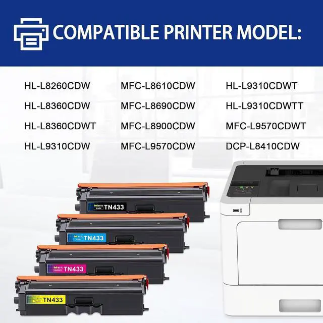Compatible TN433 Toner Printers: HL-L8260CDW HL-L8360CDW HL-L8360CDWT HL-L9310CDW HL-L9310CDWT HL-L9310CDWTT; MFC-L8610CDW MFC-L8690CDW MFC-L8900CDW MFC-L9570CDW MFC-L9570CDWT; DCP-L8410CDW Printer