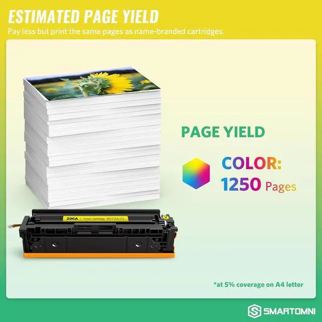 High Page Yield: Up to 1,250 pages per 206A W2110A Yellow toner cartridge (Letter/A4, at 5% coverage). Also available for 206X W2110X.