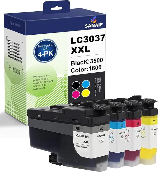 Package Contents: Compatible SANAIF LC3037XXL Ink Cartridge high capacity Black Cyan Magenta Yellow 4-Pack includes(1 x LC3037XXL Black ink, 1 x LC3037XXL Cyan ink, 1 x LC3037XXL Magenta ink, 1 x LC3037XXL Yellow ink)