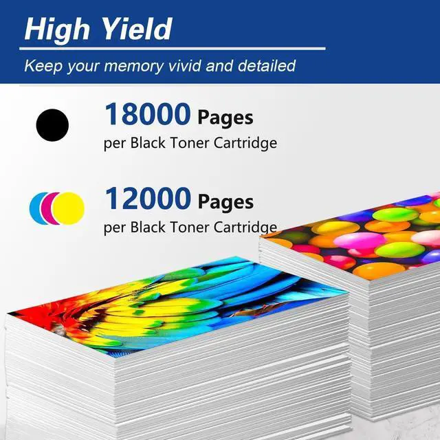 Page Yield : Black is 18,000 pages per cartridge and Color is 12,000 Pages per cartridge (at 5% coverage, Total 4 Pack)