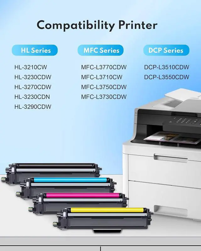 Compatible Printer: TN 223 toner cartridges compatible for Brother MFC-L3770CDW MFC-L3710CW MFC-L3750CDW MFC-L3730CDW HL-3210CW HL-3230CDW HL-3270CDW HL-3230CDN HL-3290CDW DCP-L3510CDW DCP-L3550CDW Printer.