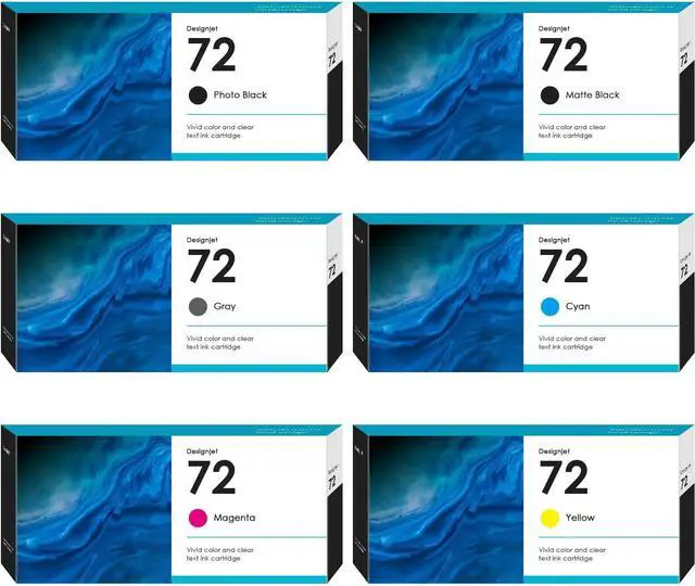 Package Contents 6-pack 72 ink set: Matte Black (C9403A), Photo Black (C9370A), Cyan (C9371A), Magenta (C9372A), Yellow (C9373A), Gray (C9374A).