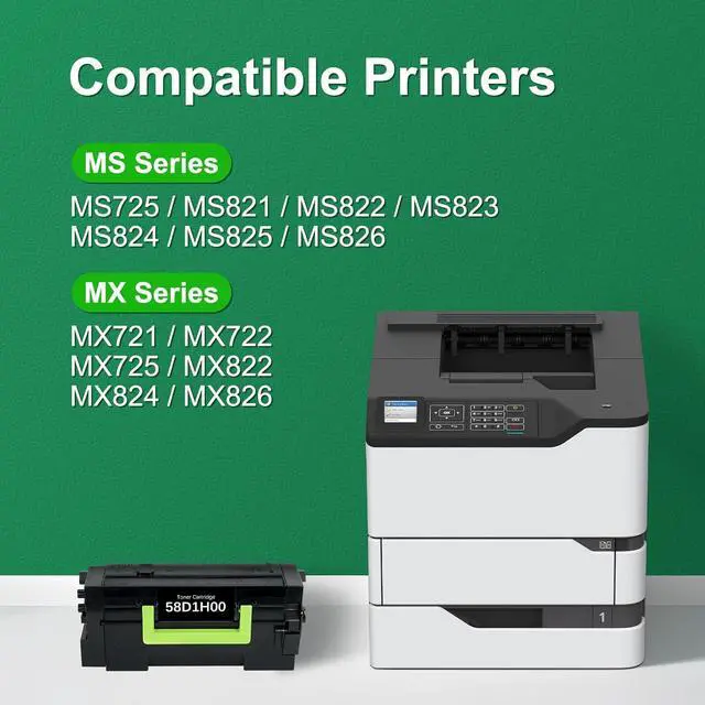Wide Compatibility Lexmark mx722 Toner: This black toner cartridge (OEM code: 58D1H00) replaces Lexmark 58D1H00, 58D1H0E, 58D0HA0, 58D0H0G toner cartridge