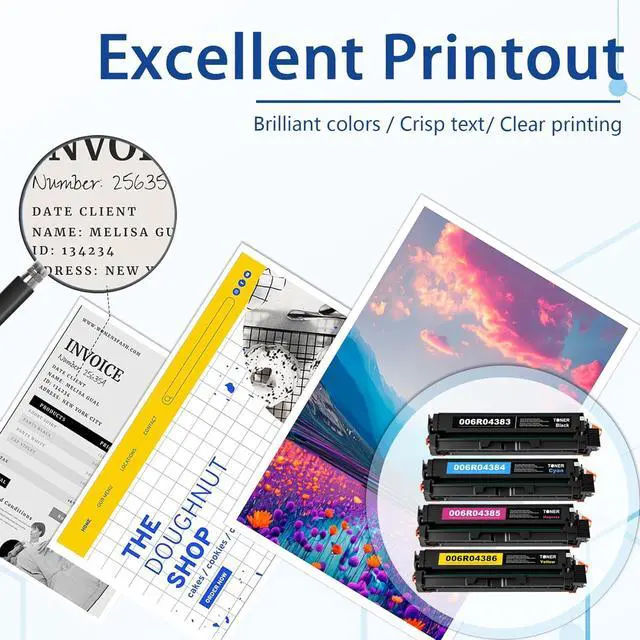 Packaging Content: 4 Pack High Yield C230 C235 Toner Cartridge, 006R04383 Toner Cartridge (Black), 006R04384 Toner Cartridge (Cyan), 006R04385 Toner Cartridge (Magenta), 006R04386 Toner Cartridge (Yellow)