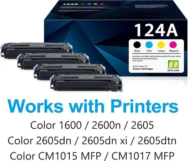 Package Contents: 1 pack 124a q6000a black toner, 1 pack 124a q6001a cyan toner, 1 pack 124a q6002a yellow toner, 1 pack 124a q6003a magenta toner