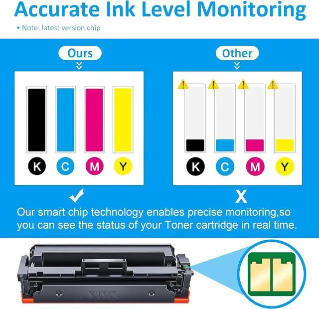 The 410A toner with chip feature an integrated intelligent chip that ensures smooth compatibility with supported printers, accurately tracks toner levels, and optimizes printer performance for consistent and reliable printing