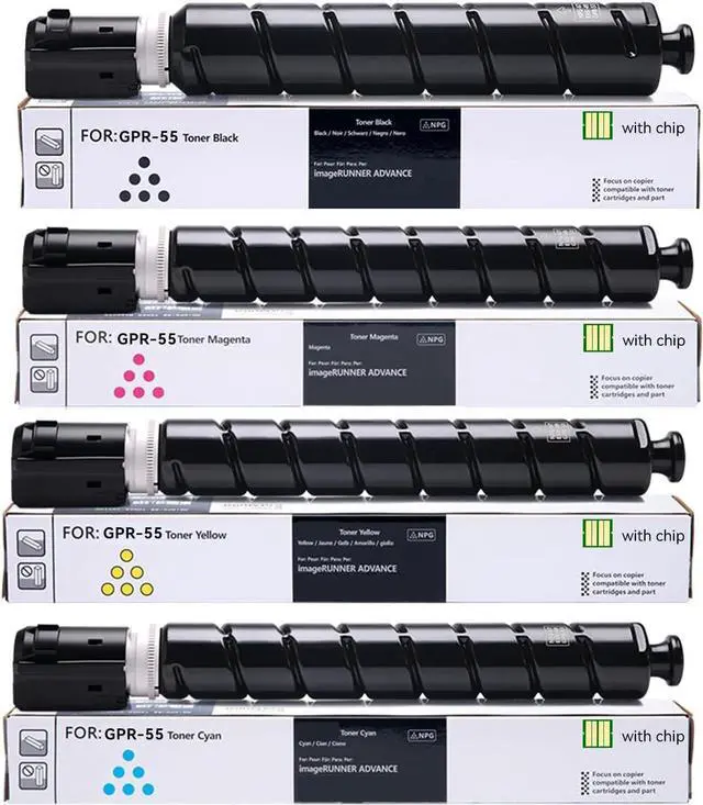 The packaging contains: 4 Pack of GPR-55 Toner Cartridge (0481C003 0482C003 0483C003 0484C003)