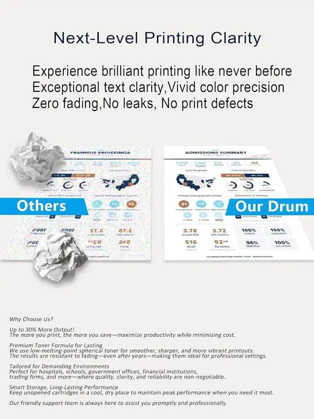 Quality service:For any inquiries or concerns regarding your DR431CL drum unit, contact our dedicated support teamwe guarantee prompt, expert solutions. Backed by a 180 days warranty and 24/7 assistance, your satisfaction is our priority.