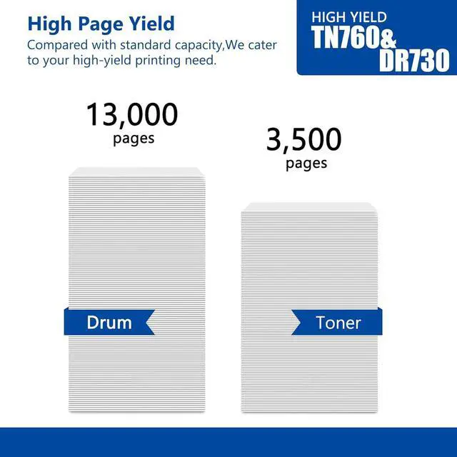 High Page Yield: 3,500 pages per TN760 Toner Cartridge and 13,000 Pages per DR730 Drum Unit at 5% coverage
