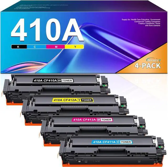 What's in the box: 4 packs 410A toner cartridges Replacement for HP 410A CF410A CF411A CF412A CF413A black cyan yellow magenta toner cartridge