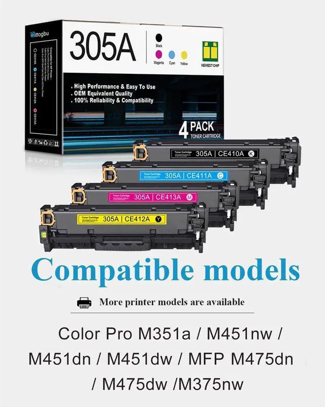 Product in the box: 4 Packs 305A toner cartridge, 305A CE410A CE411A CE412A CE413A toner (1 Black, 1 Cyan, 1 Magenta, 1 Yellow )