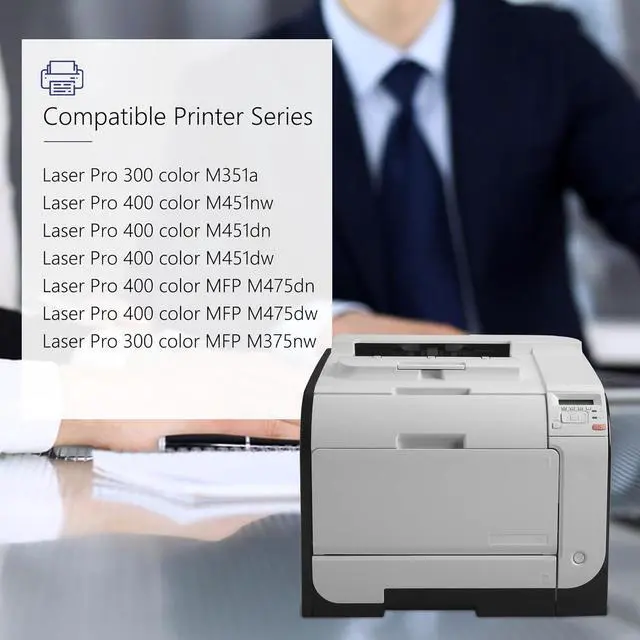 This cartridge works with: Laser Pro 400 color M451nw M451dn M451dw, MFP M475dn M475dw; Laser Pro 300 color M351a, MFP M375nw Printer