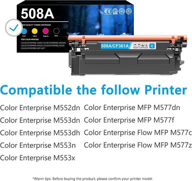Package Contents: 1 X 508A (CF360A) Black Toner Cartridge, 1 X 508A (CF361A) Cyan Toner Cartridge, 1 X 508A (CF362A) Yellow Toner Cartridge, 1 X 508A (CF363A) Magenta Toner Cartridge
