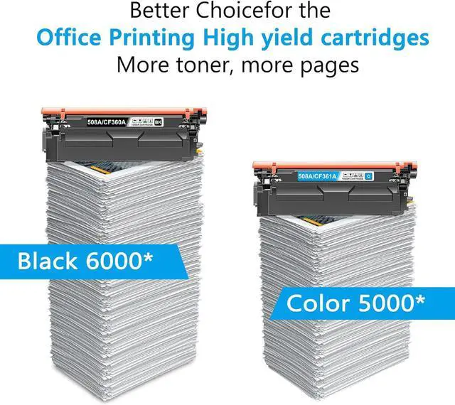 High Page Yield: Up to 6000 Pages per black toner cartridge and 5000 Pages per color cartridges (based on 5% coverage test on A4 paper)