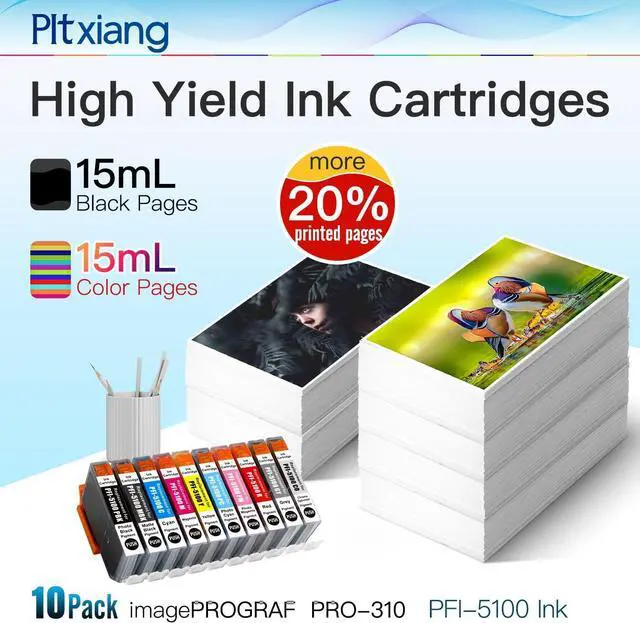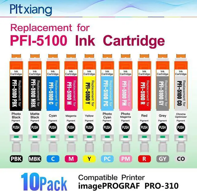 Replacement for Canon PFI-5100 Ink Cartridges; fully Compatible with Canon ImagePROGRAF PRO-310 Printer. 10-color set (MBK, PBK, C, M, Y, PC, PM, R, GY, CO); ideal for users needing Replacement for Canon PFI-5100 ink or Compatible with Canon ImagePROGRAF PRO-310 ink.