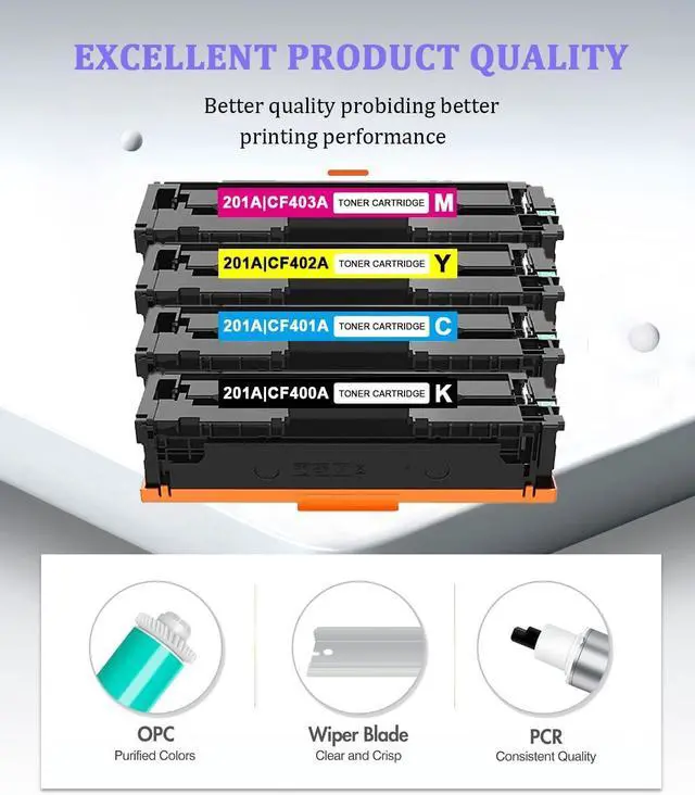Package Contents: 4 Pack of Remanufactured Toner Cartridges Replacement for HP 201A Toner cartridges combo pack(1 Black,1 Cyan,1 Magenta,1 Yellow)