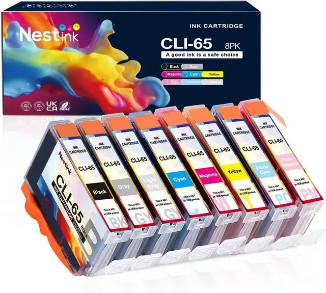 Package Contents: 8-Pack CLI-65 CLI-65BK CLI-65C CLI-65M CLI-65Y CLI-65PC CLI-65PM CLI-65GY CLI-65LGY Ink (1x CLI65 Black)(1x CLI65 Cyan)(1x CLI65 Magenta)(1x CLI65 Yellow)(1x CLI65 Photo cyan)(1x CLI65 Photo magenta)(1x CLI65 Grey)(1x CLI65 Light grey)