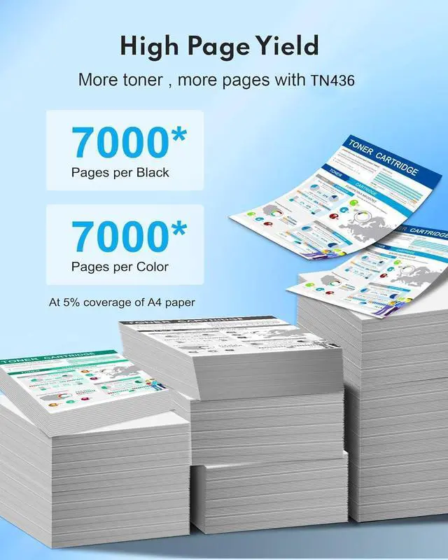 High Page Yield: Up to 7,000 pages per TN436BK toner cartridge; Up to 7,000 pages per TN436 C/M/Y Color toner cartridge (Letter/A4, at 5% Coverage)