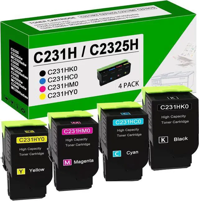 Package Contents: 1x C231HK0 Black toner cartridge,1x C231HC0 Cyan toner cartridge,1x C231HM0 Magenta toner cartridge,1x C231HY0 Yellow toner cartridge