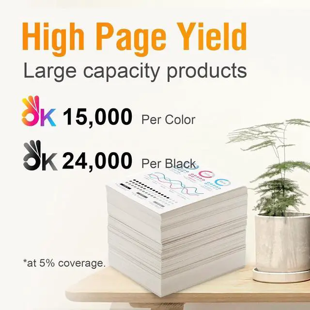 High page yield:Black is 24000 pages per cartridge, Color is 15000 pages per cartridge (5% coverage)