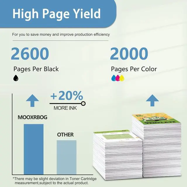 High Page Yield: Black is 2,600 pages per cartridge and Color is 2,000 Pages per cartridge (at 5% coverage, Total 4 Pack)
