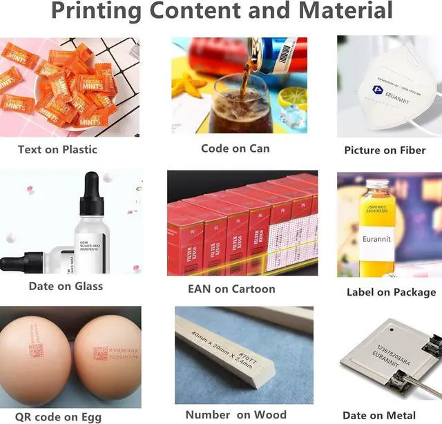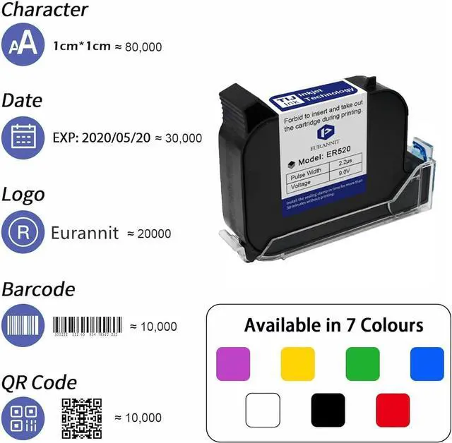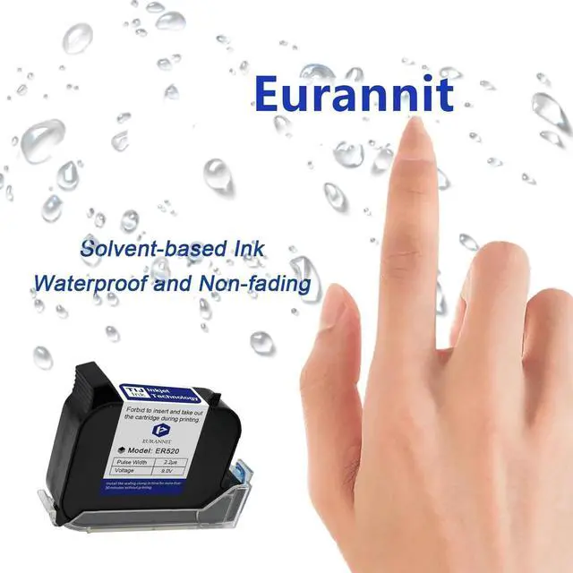 Eurannit original ink cartridge, clear and stable coding effect, 600DPI high-definition printhead, no ink dripping, no plugging, strong adhesion. Production date can be printed about 8000-15000 times. Widely used in a variety of materials, including wood, acrylic materials, aluminum, chinaware, cloth, paper, Carton, Wood, plastic, metal, stone, metal, fabric, glass, labels, leather, etc.(Drying takes 3-5 seconds)