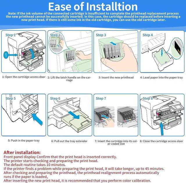 High Performance The upgraded print head chip can identify ink cartridges faster, and the print head has smooth ink jetting, protecting the printer, clear printing, bright colors, and making your life more colorful.Easy to install This printhead package contains only one printer head, no other accessories, and no additional tool assistance is required, just simply push the print head to complete the installation, saving your time
